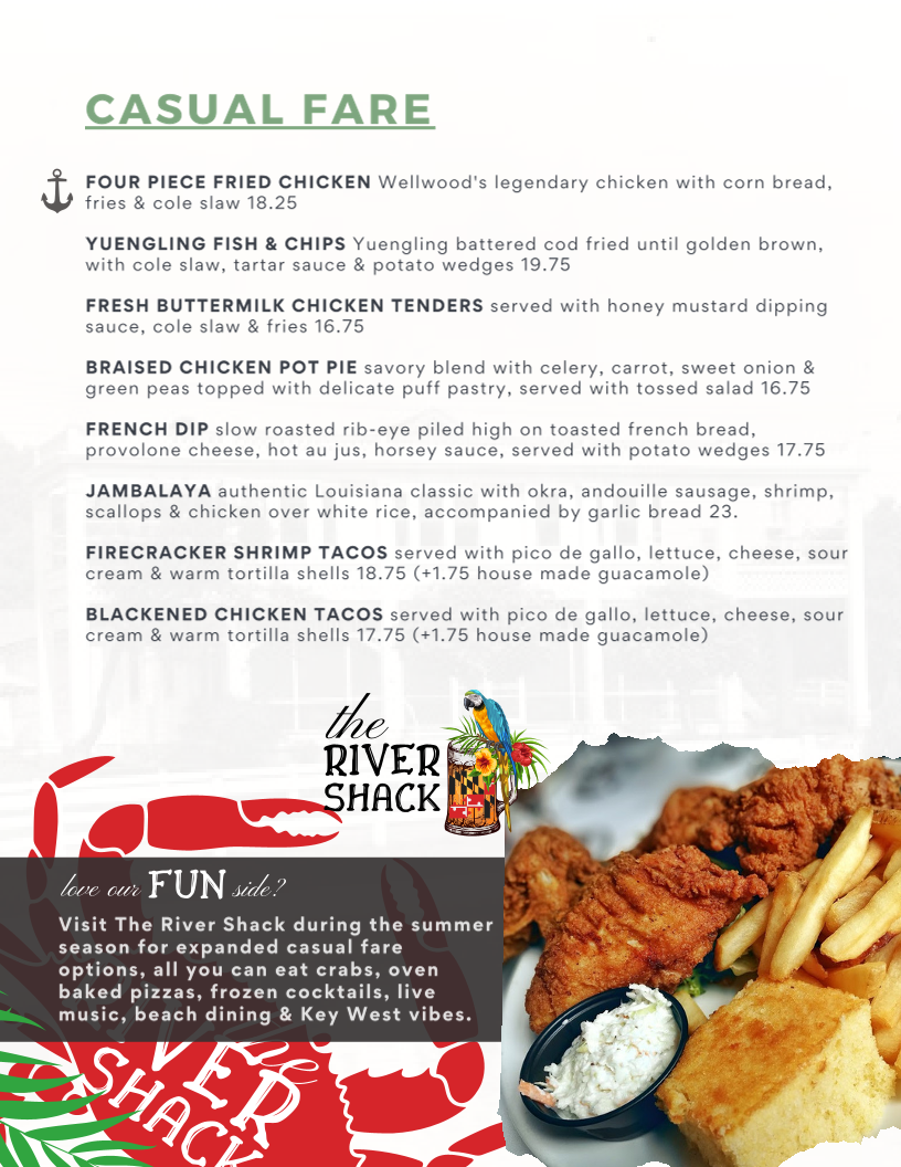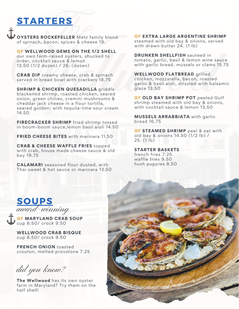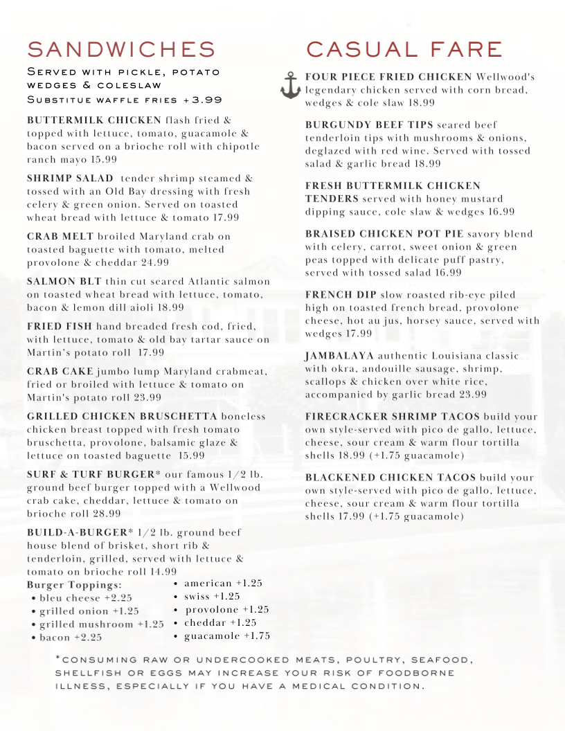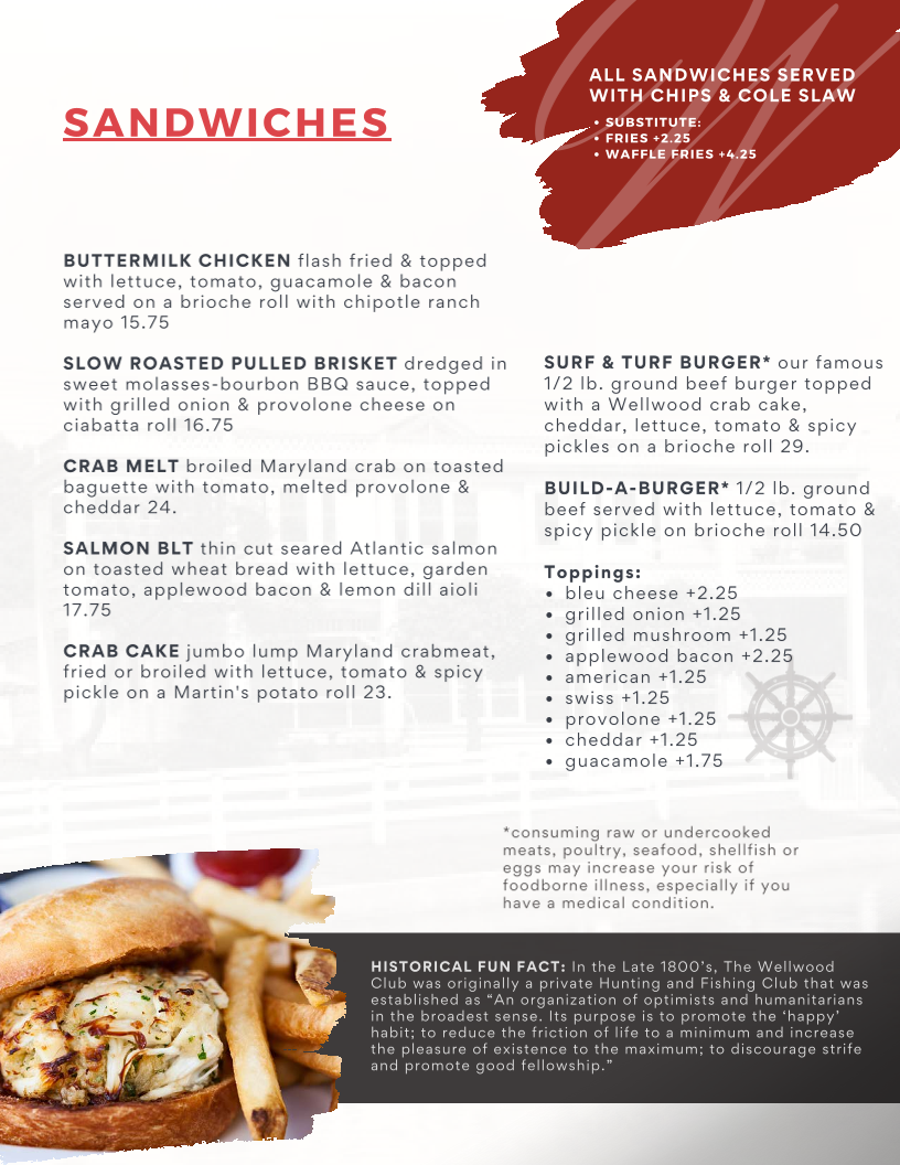 Introducing the menu at The Wellwood Restaurant is an experience that delights the senses, set against a charming riverfront backdrop in Charlestown, MD. With a focus on fresh, locally sourced ingredients, the menu shines with standout offerings. Begin with the Buttermilk Chicken Sandwich, a crispy treat adorned with guacamole and chipotle ranch mayo, or indulge in the flavorful Shrimp Salad bursting with Old Bay seasoning. For seafood lovers, The Wellwood is a treasure trove, featuring their renowned Crab Cake Dinner and a sumptuous Surf & Turf combination of filet mignon and lobster tail.