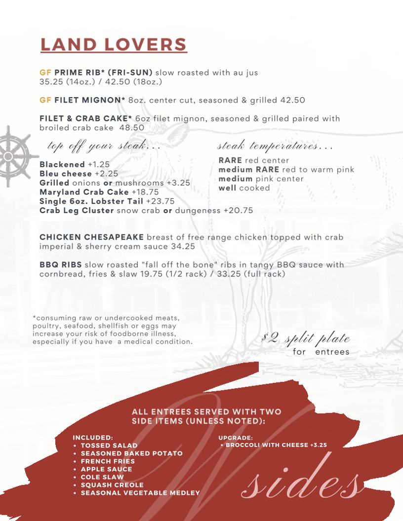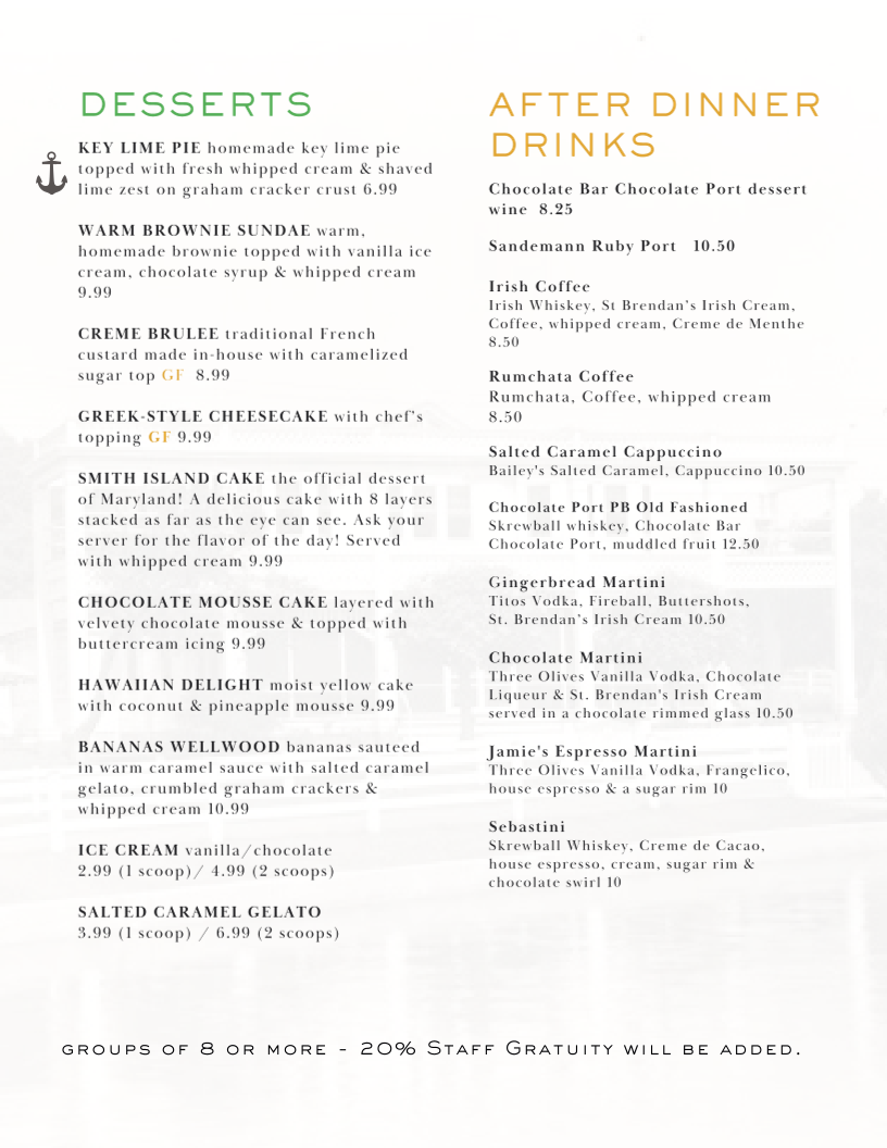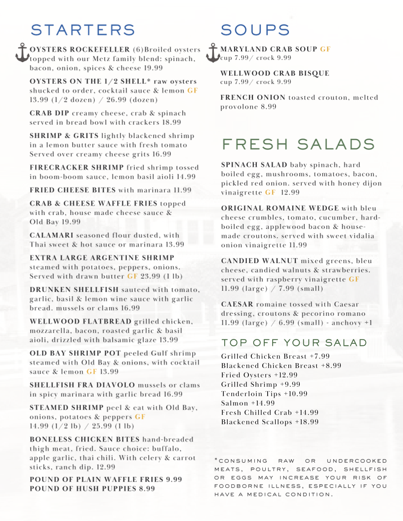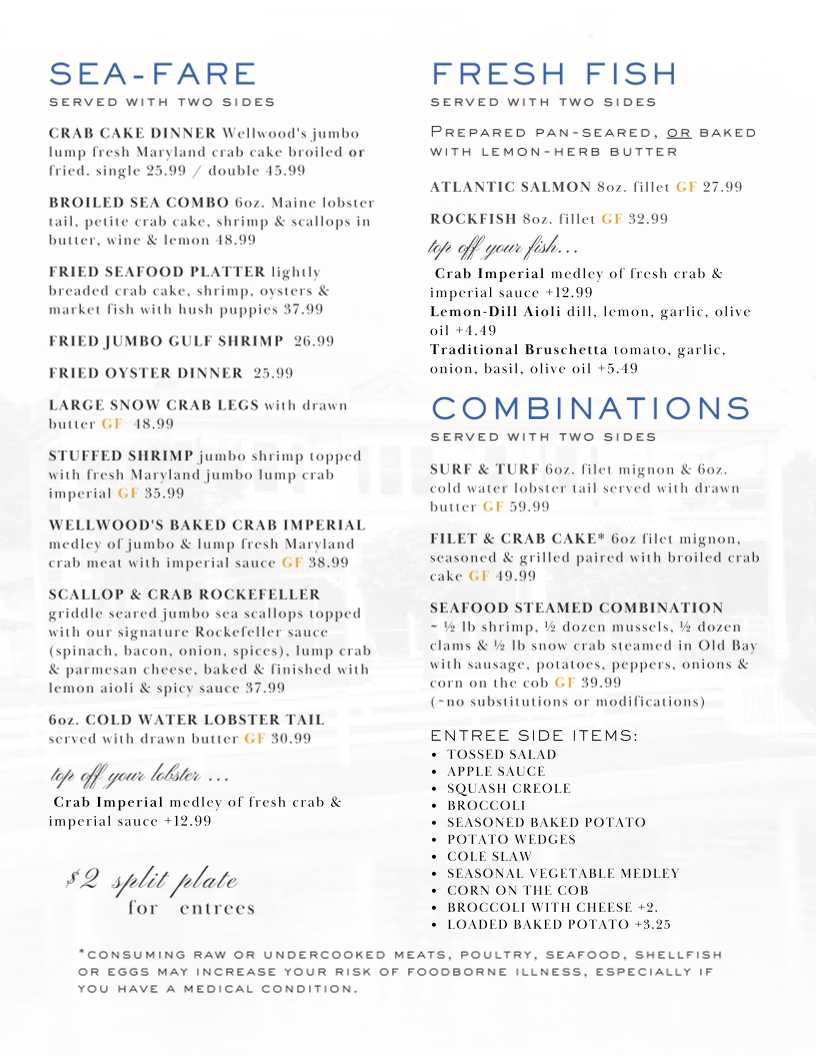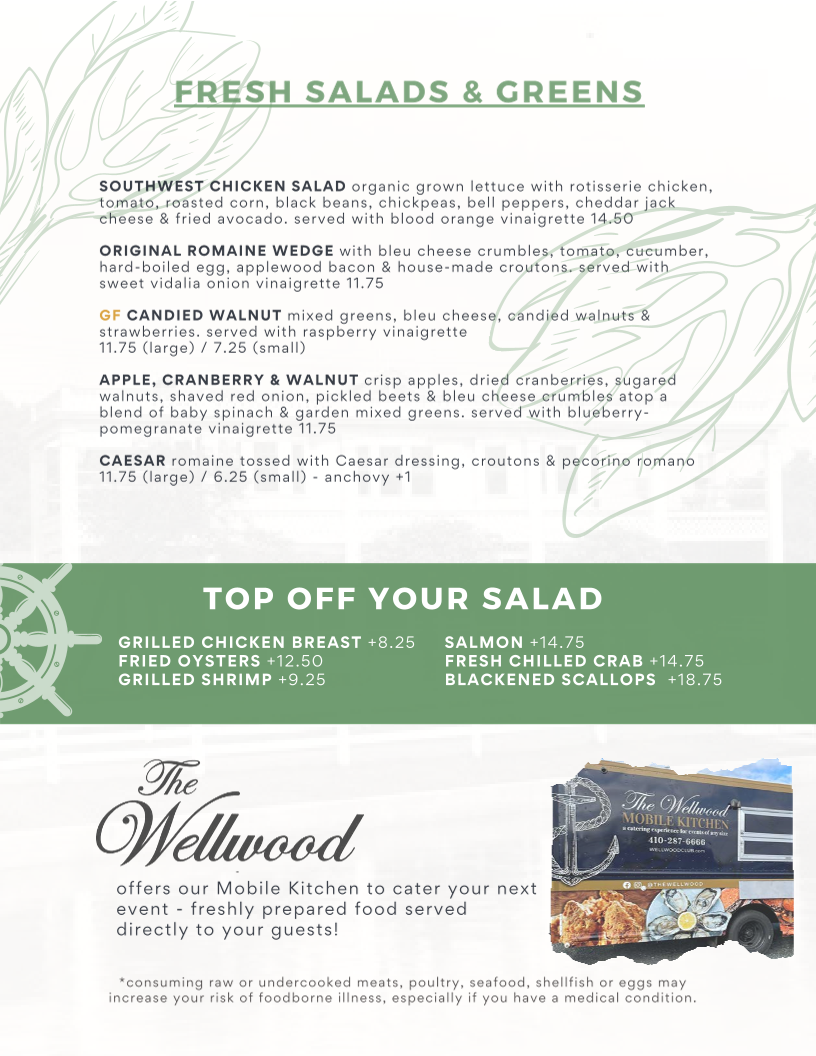 Introducing the menu at The Wellwood Restaurant is an experience that delights the senses, set against a charming riverfront backdrop in Charlestown, MD. With a focus on fresh, locally sourced ingredients, the menu shines with standout offerings. Begin with the Buttermilk Chicken Sandwich, a crispy treat adorned with guacamole and chipotle ranch mayo, or indulge in the flavorful Shrimp Salad bursting with Old Bay seasoning. For seafood lovers, The Wellwood is a treasure trove, featuring their renowned Crab Cake Dinner and a sumptuous Surf & Turf combination of filet mignon and lobster tail.